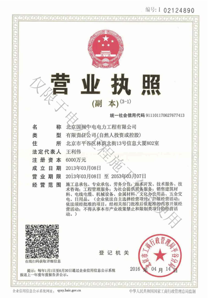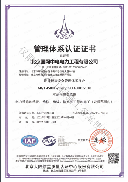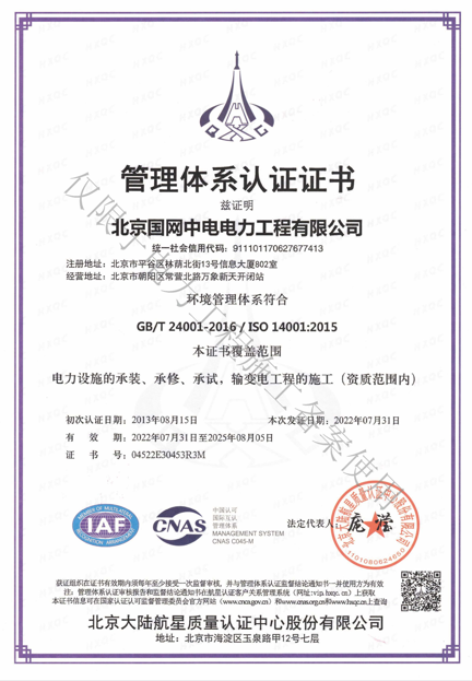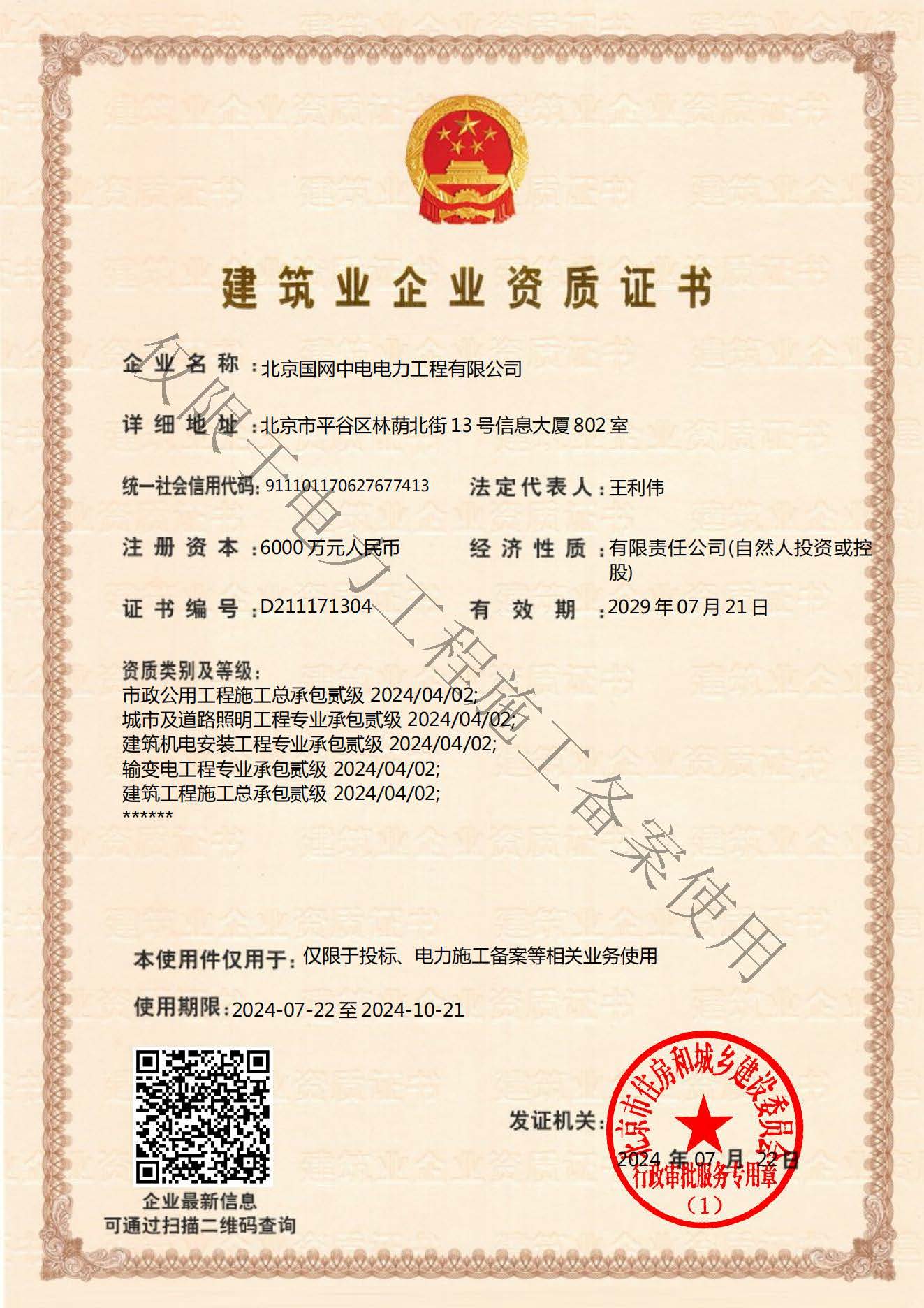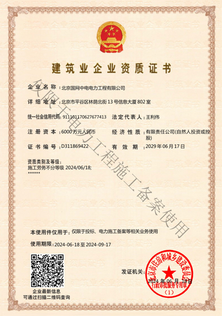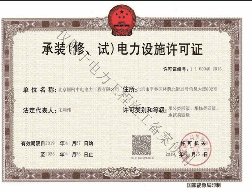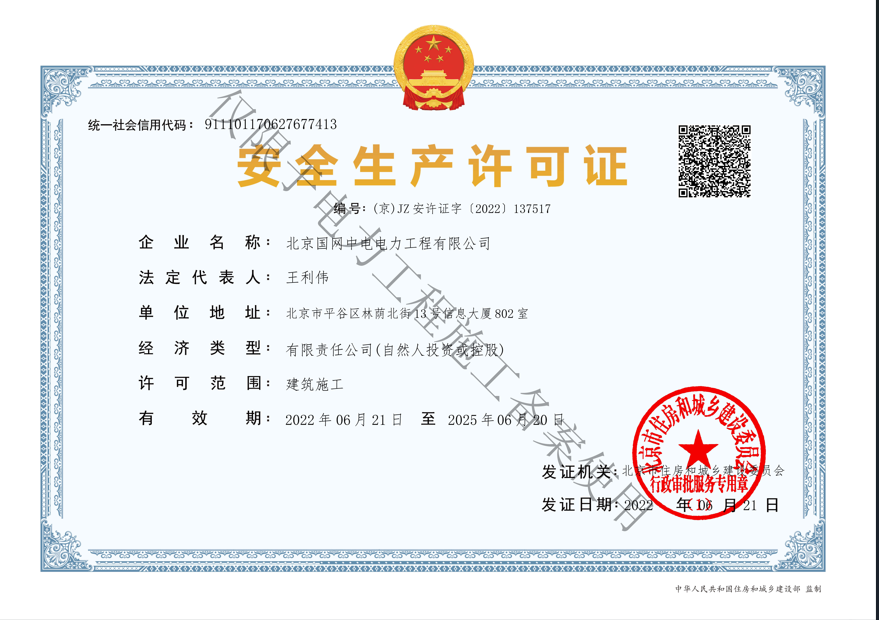 北京國網中電電力工程有限公司,已取得國家電監(jiān)會頒發(fā)的《承裝(修、試)電力設施許可證》、為電力施工承裝四級、承修四級、承試四級企業(yè)。北京市住房和城鄉(xiāng)建設委員會頒發(fā)的房屋建筑施工總承包二級、機電設備安裝工程專業(yè)承包二級、輸變電專業(yè)承包二級、城市及道路照明工程專業(yè)承包二級、市政公用工程總承包二級資質、勞務不分等級,已通過ISO9001:2015 GB/T50430-2017質量管理體系、GB/T24001-2016/ISO 14001:2015環(huán)境管理體系、